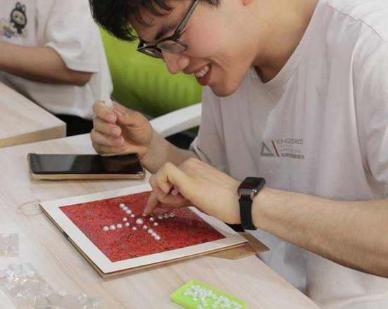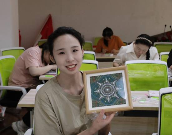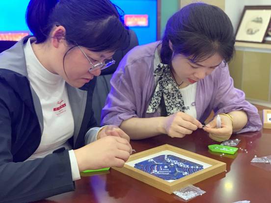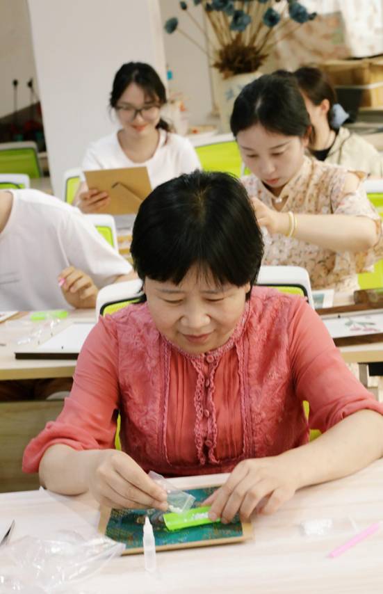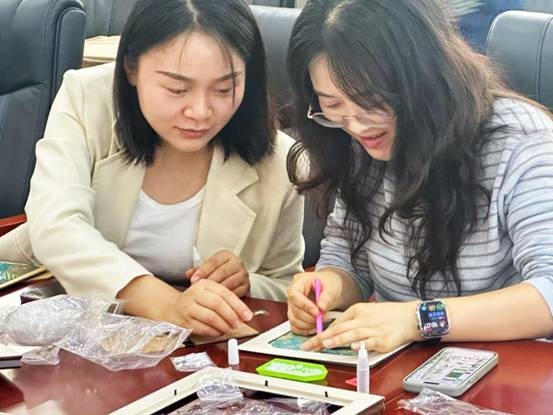 老师们脸上洋溢着轻松的笑容,开心的交流着彼此的制作心得,互相的夸赞是最美的声音。每一颗珍珠的排布都是与自我对话的轨迹,指尖轻触间,一颗颗珍珠拼贴于宋锦之上,指尖流转间 ,焦虑悄然消融,在对称美学中重获内心秩序造就独一无二的装饰品,感受身心的放松与愉悦。