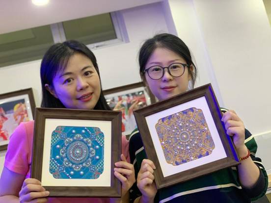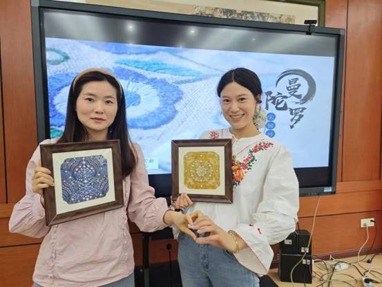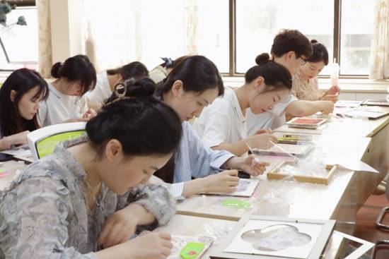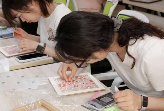 老师们优雅地音乐声中放松心灵,从赏析宋锦纹样、挑选珍珠、布局创作,亲手体验宋锦珍珠画制作。在宋锦上用珍珠重构曼陀罗图腾,开启了一场跨越时空的东方美学修行。