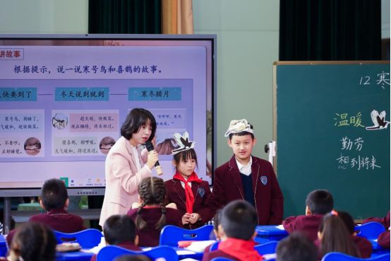 10月25日上午,研讨活动按低、中、高三个学段同步开设单元整体教学课例展示。其中低年级组,广东教研团队以“品故事之趣,享思考之乐”为主题,生动呈现二年级上册第五单元《坐井观天》《寒号鸟》两篇课文及口语交际课《商量》的整合教学。