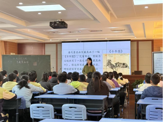 六年级组余丽菊老师、王晴老师接力《文言文二则》,从“文言初读方法”到“文本思辨理解”,构建单元学习闭环;苏婷老师以“口语交际·聊聊书法”串联单元文化主题,呼应文言教学中的传统元素。王佳佳老师以思维导图梳理创作脉络,是单元教学的“踏实铺路人”;陈雅迪老师接棒用配乐品读深化联想表达,让“艺术之美”在课堂里生动落地。