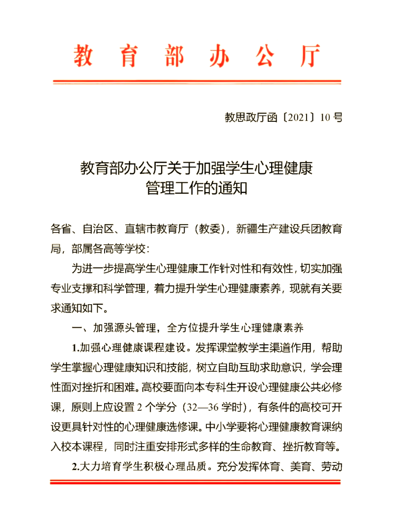 · 《教育部办公厅关于加强学生心理健康管理工作的通知》(教思政厅函〔2021〕10号)