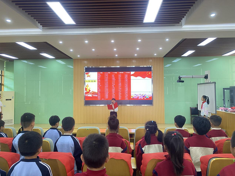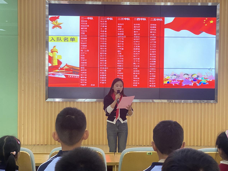 大队辅导员张婷婷老师宣读组建少先队组织的决定以及新队员名单,老队员代表为新队员佩戴红领巾,祝贺他们成为一名光荣的少先队员,每位新队员的脸上都洋溢着激动的笑容,这无疑似他们人生中极为重要的时刻!