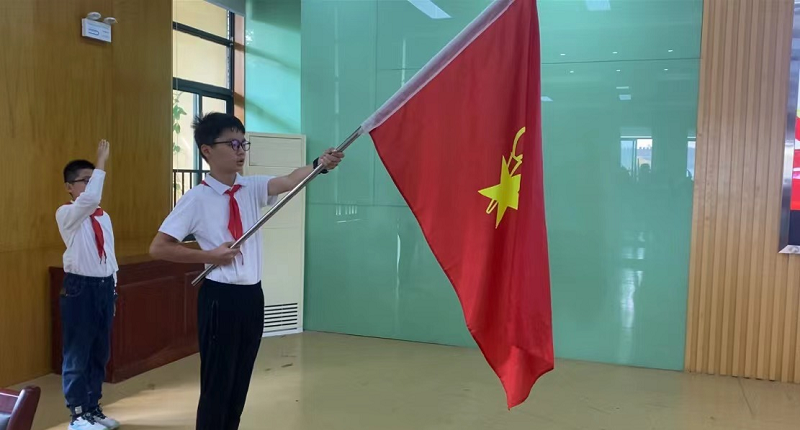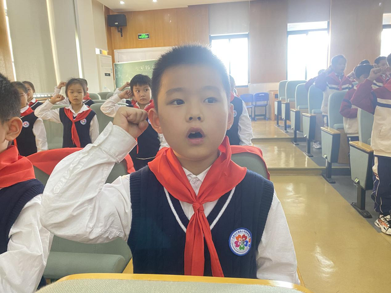 面向鲜艳的大队旗,紧握的右拳是我们的决心,响亮的宣誓是我们的承诺。在大队委的带领下,新队员在队旗下宣誓,老队员重温入队誓词。每位队员整齐划一地举起右拳,发出属于自己的呐喊!