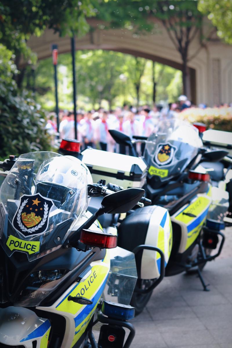 “哇!交警骑着摩托车进我们学校了。”
