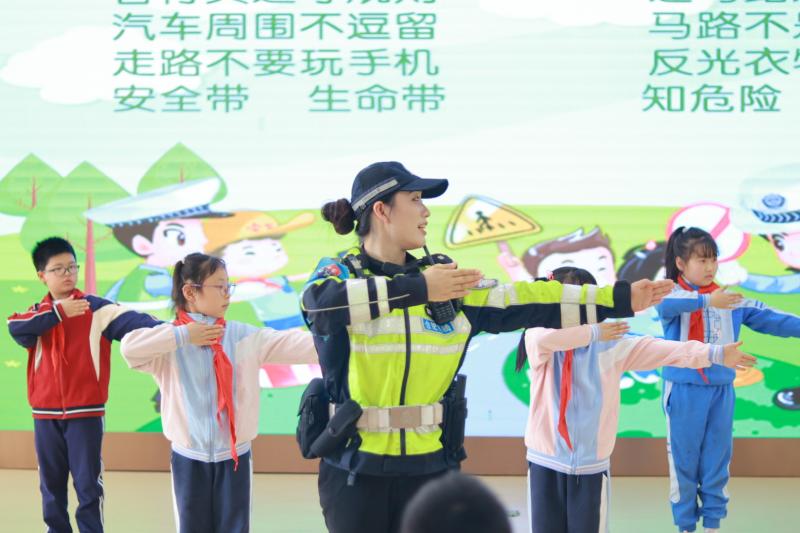 接着,肖警官手把手带领同学们做交通安全手势操,让同学们认识到交通安全的重要性,叮嘱每一位同学都要遵守交通法规,引导同学们从小养成文明交通习惯。在肖警官的一步步引导下,同学们也积极回答问题,现场气氛十分活跃。