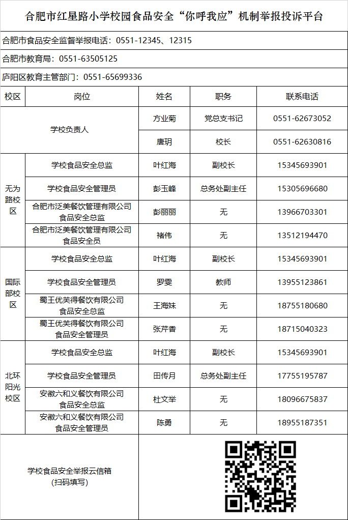 为落实安徽省食品安全委员会办公室、省教育厅、省市场监督管理局联合印发的《学校建立食品安全“你呼我应”工作机制(试行)》文件精神,进一步畅通交流渠道,合肥市红星路小学现建立“你呼我应”机制,及时回应广大师生及家长关于学校食品安全方面的意见和建议,更好地呵护广大师生“舌尖上的安全”,切实增强广大师生的获得感、幸福感和安全感。为进一步畅通交流渠道,及时回应家长及师生诉求,反馈意见和建议,可以通过以下渠道反映有关食品质量与安全等问题。