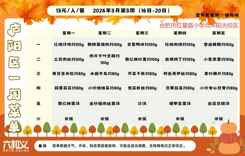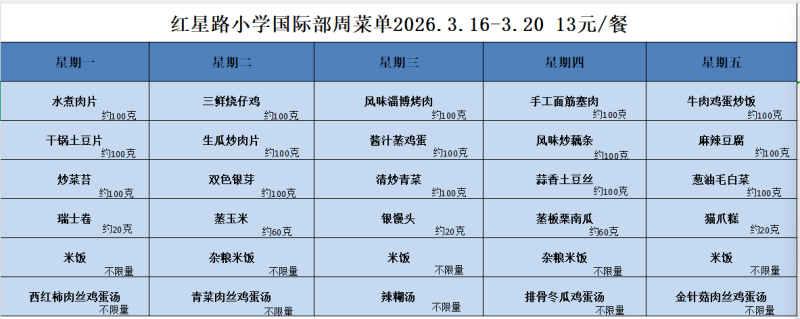 一、每人每餐13元;本菜单带量为基本重量,会根据年级适当添加重量。