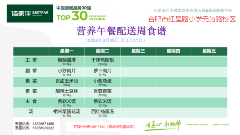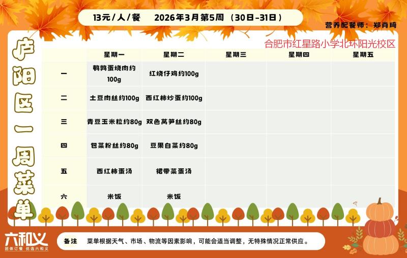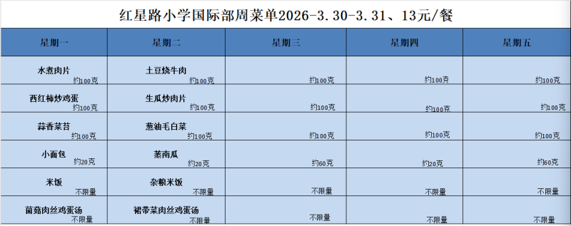 一、每人每餐13元;本菜单带量为基本重量,会根据年级适当添加重量。