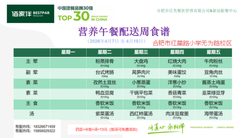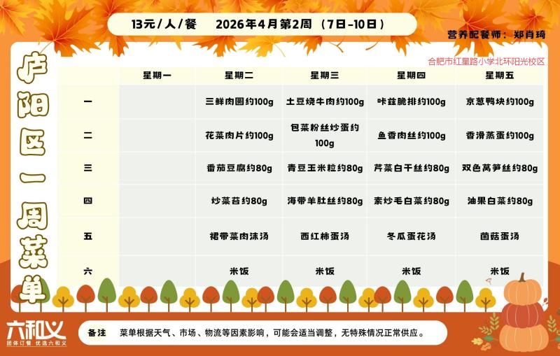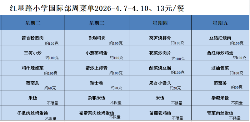 一、每人每餐13元;本菜单带量为基本重量,会根据年级适当添加重量。
