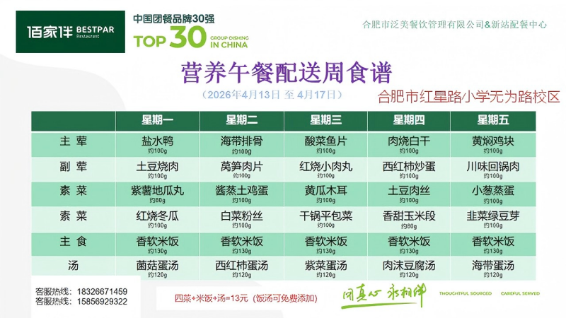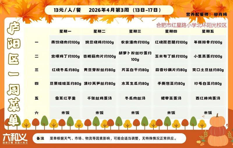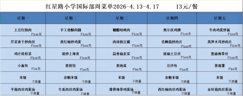 一、每人每餐13元;本菜单带量为基本重量,会根据年级适当添加重量。
