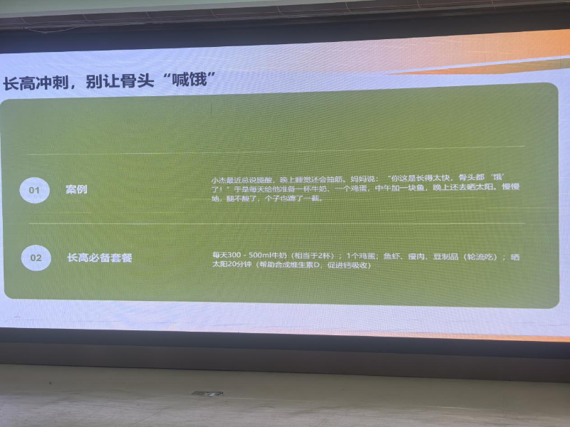 课堂上,薛老师将身体比作茁壮成长的小树苗,生动阐释了营养与身体成长的紧密联系,让孩子们明白不同食物是身体获取能量和“建筑材料”的重要来源。结合小学不同年级学生的生长发育特点,薛老师打造了“营养星球之旅”特色教学环节,分设换牙星、护眼能量星、长高冲刺星三个特色站点,为低年级、中年级、高年级学生分别讲解专属营养知识。用真实案例让孩子们直观感受合理饮食的重要性。
